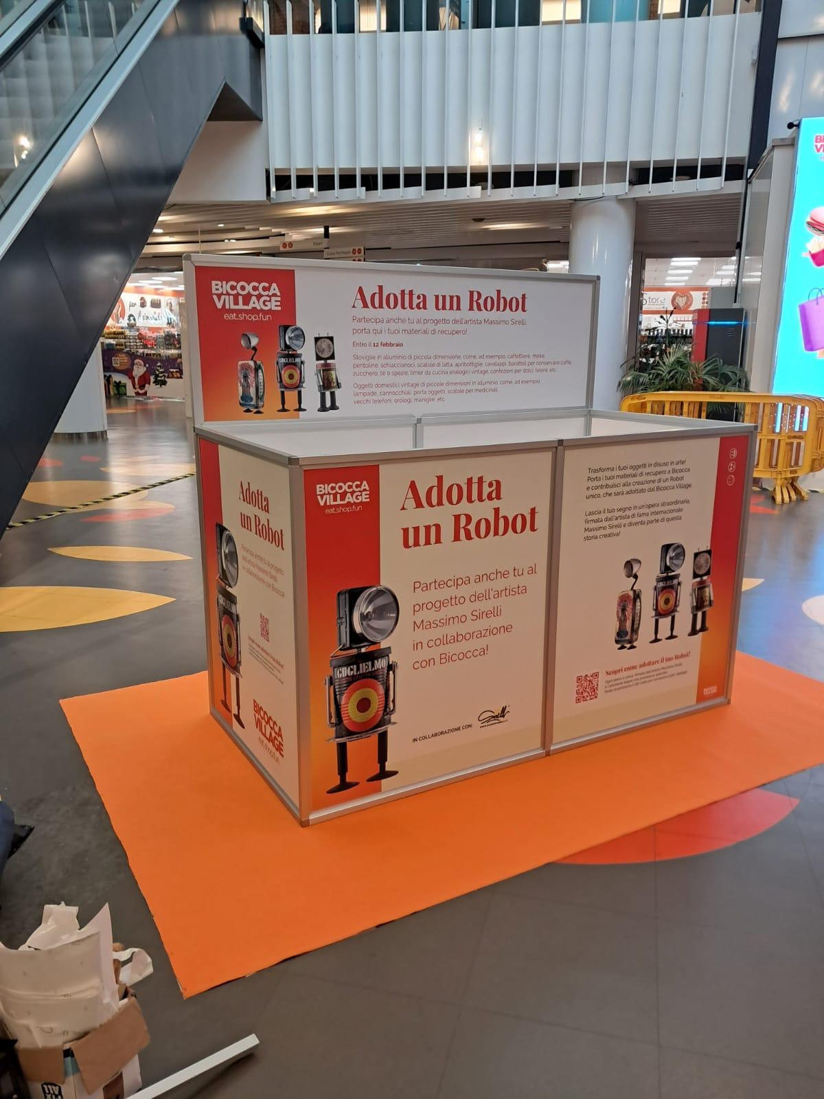 Nel progetto realizzato al Bicocca Village, l’intervento si è sviluppato attraverso una live performance con la creazione di due robot monumentali, successivamente esposti all’interno della galleria, trasformando l’evento in un’esperienza prolungata nel tempo.